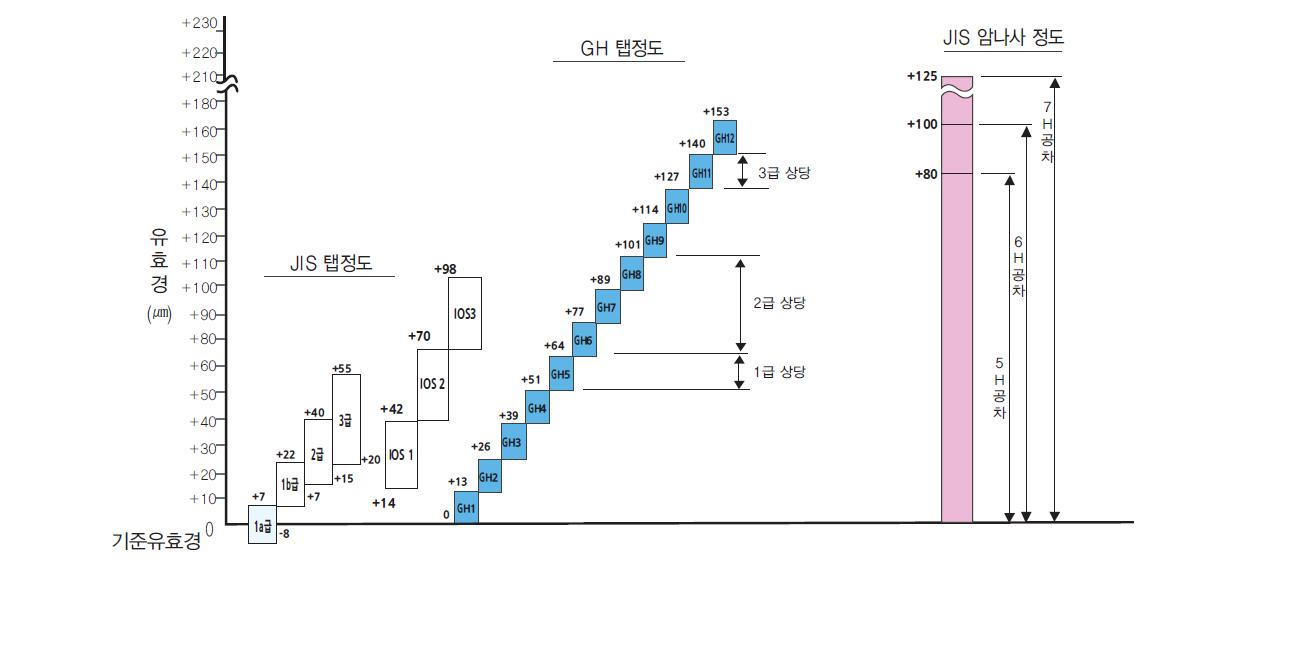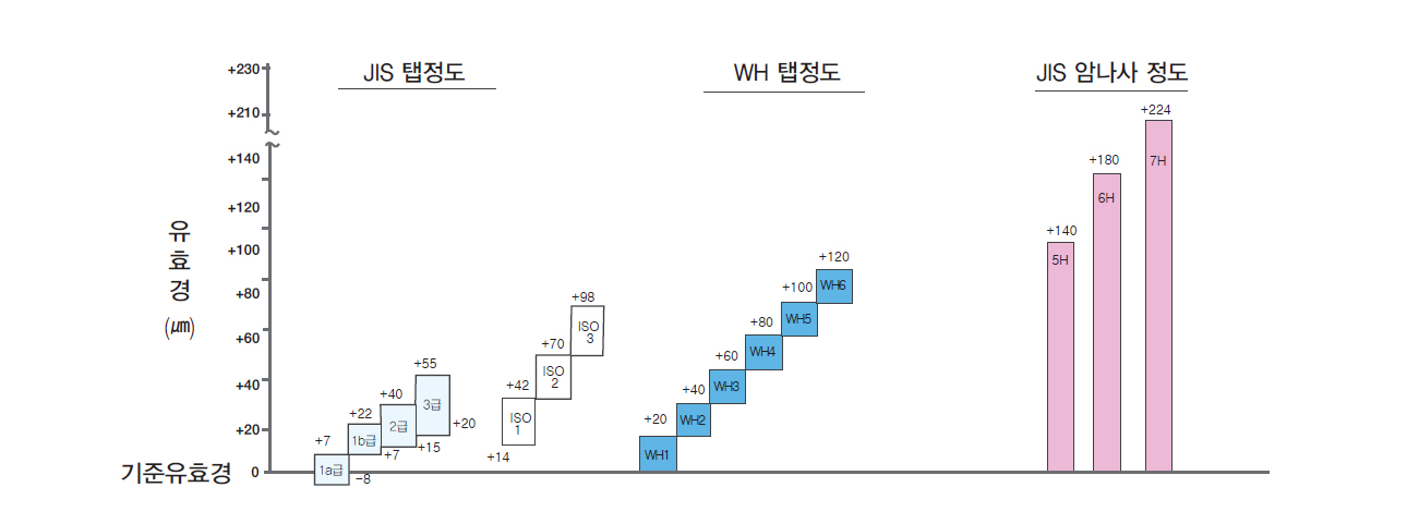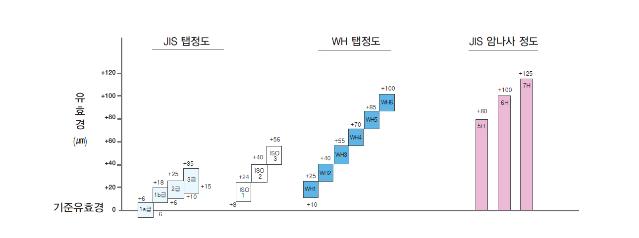(주)위딘 용도별 탭은 소정의 암나사 정도를 만족시키기 위하여 독특한 WH방식의 단계식 정도 방식을 적용하여 작업조건에 맞도록 공구 선정이 가능합니다.
