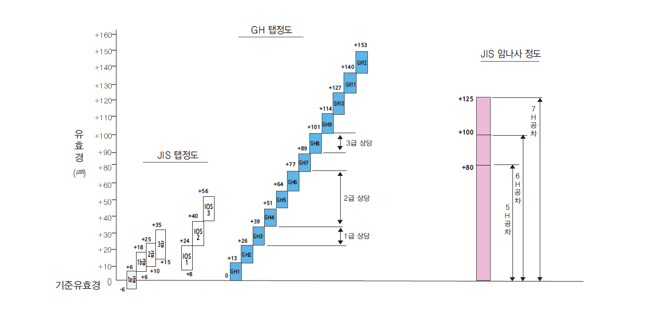 홈없는 탭(롤 탭)은 소성변형에 의하여 암나사를 가공하기 때문에 절삭탭과는 달리 엄격한 밑구멍 지름 관리가 필요하며 이에 엄격한 탭의 정도를 적용하고 있습니다. (주)위딘에서는 공차 12.7㎛(0.0005)의 단계식 정도를 채용하고 있습니다.