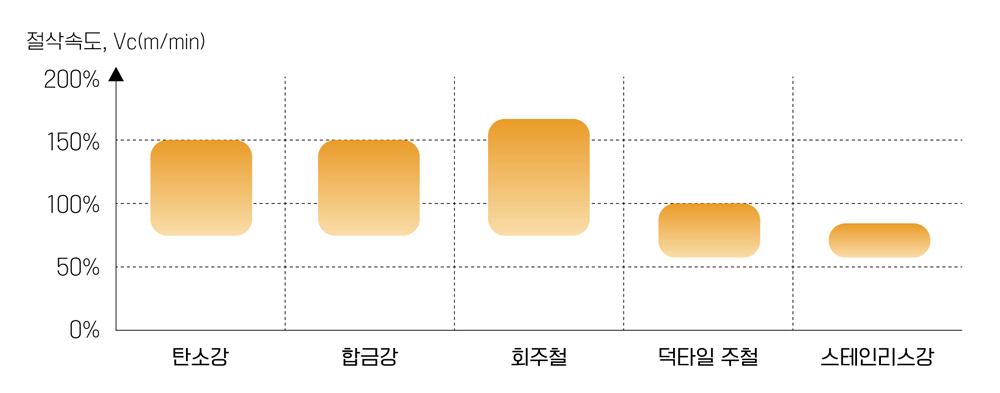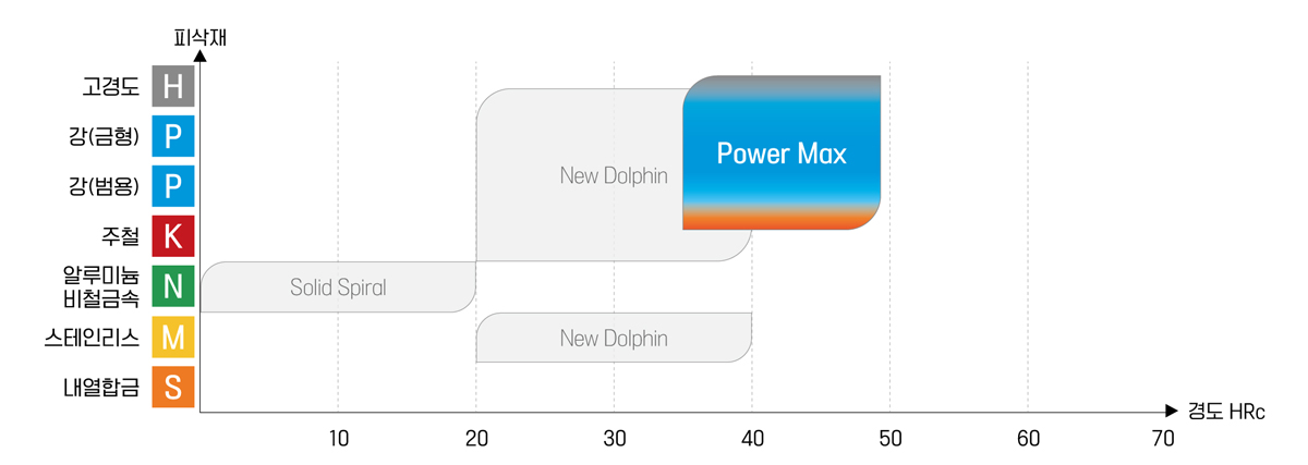 - 합금강, 주철, 스테인리스강, 프리하든강 등 피삭재(추천 : ~ HRc 50)의 고속 가공에 적합