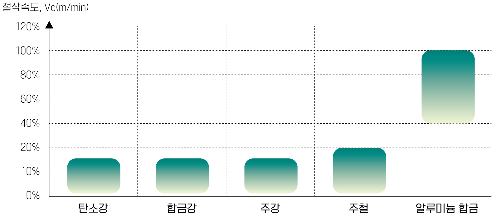 탄소강, 합금강 및 프리하든강이나 동, 주철, 알루미늄 등 피삭재 가공에 적합